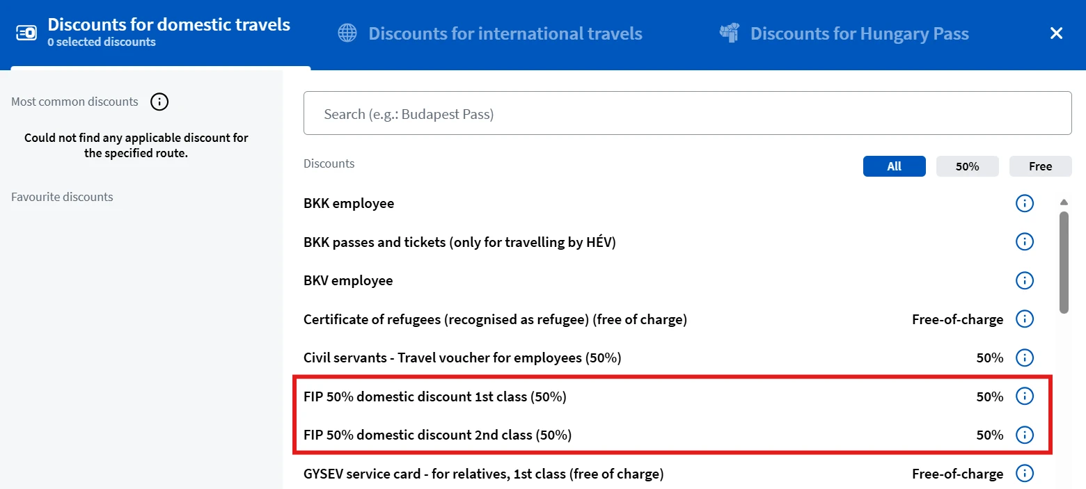 FIP 50 Tickets for MÁV and GySEV connections are sold on the MÁV booking website. To add the FIP 50 discount, on the connection search page under Passengers and Discounts, the passenger overview must be opened. Only after entering the date of birth can the FIP 50 discount be added with Add Discounts. A distinction is made between FIP 50 1st class and 2nd class. The class refers to the eligibility, not the desired class of the ticket.