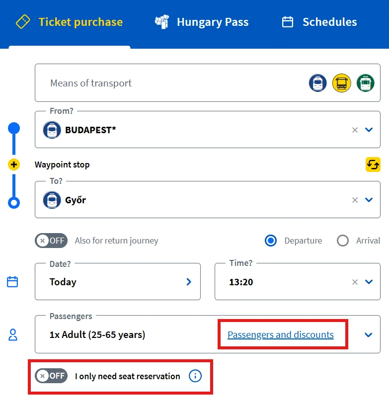 Reservations for MÁV and GySEV trains can be purchased online for 990 HUF. To do this, the option I only need seat reservation must be selected in the connection search.